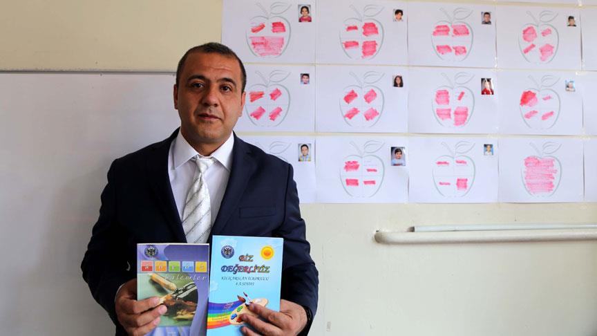 Her fotoğrafın altına çizilen elmayı dört parçaya bölerek içerisine okul içi davranışlar, evdeki davranışlar, çalışkanlık ve dürüstlük yazdığını aktaran Erarslan, öğrencilerin davranışına göre elmanın dilimlerini kırmızıya boyadığını söyledi.