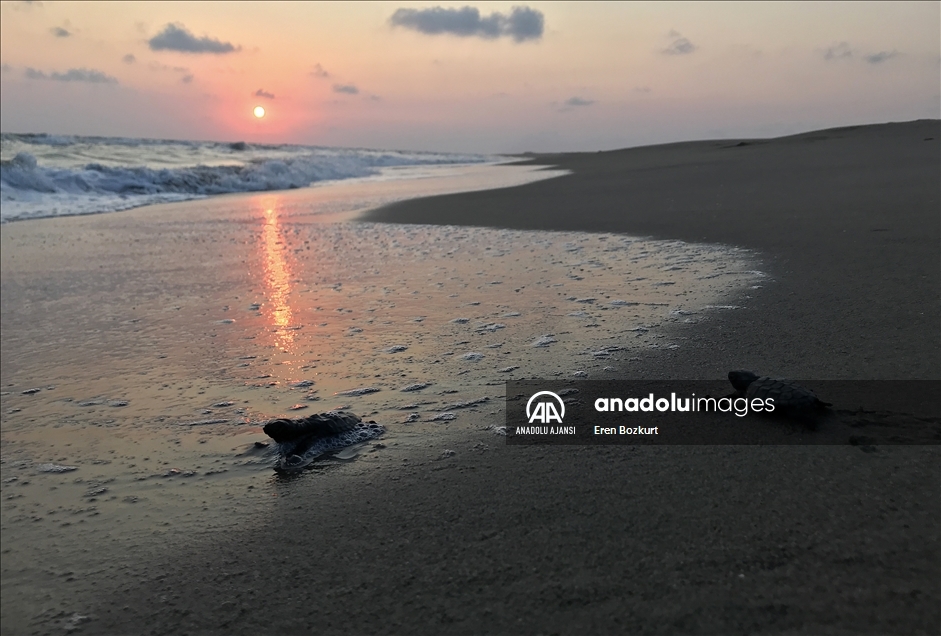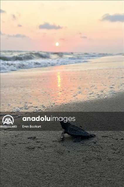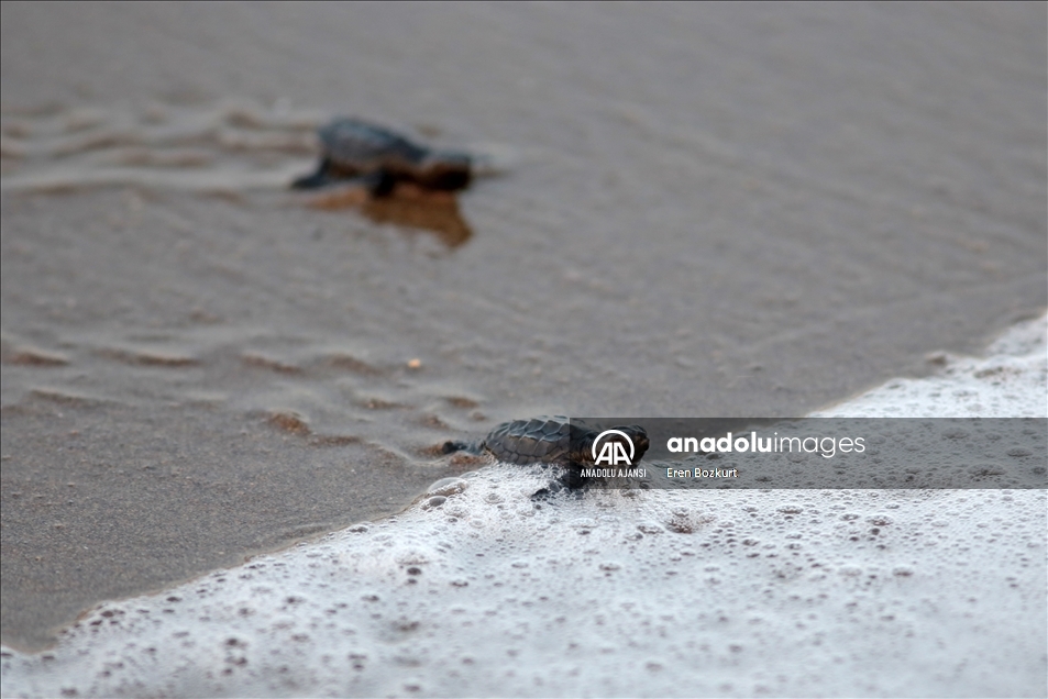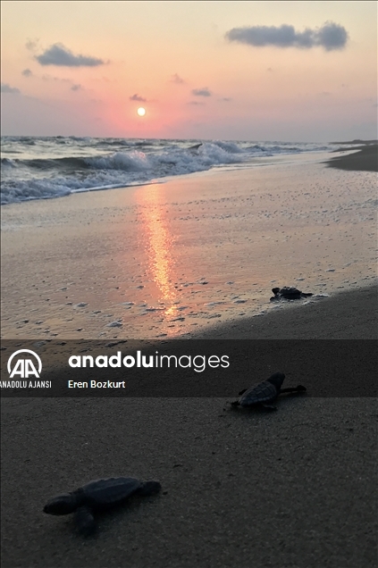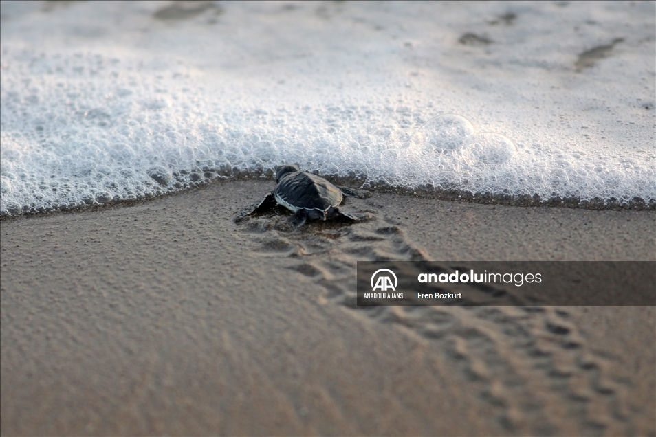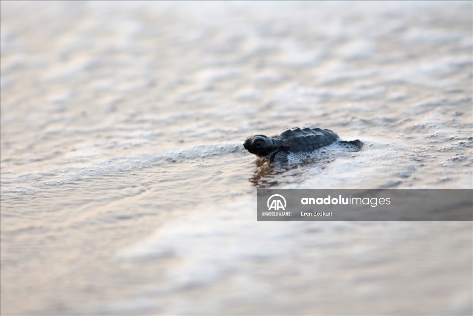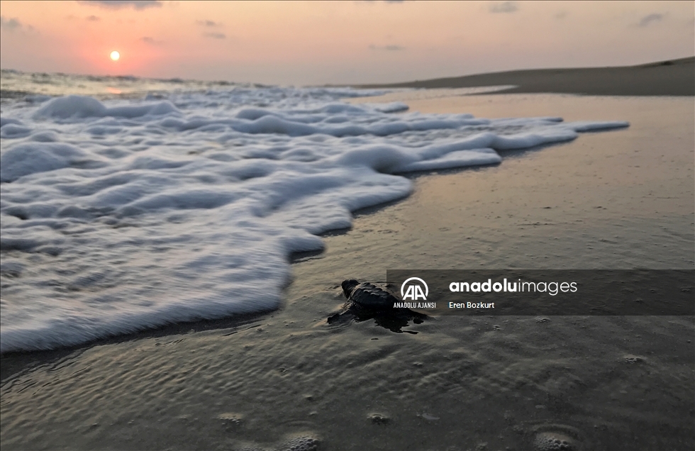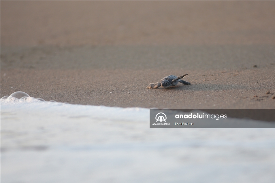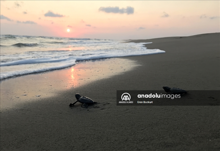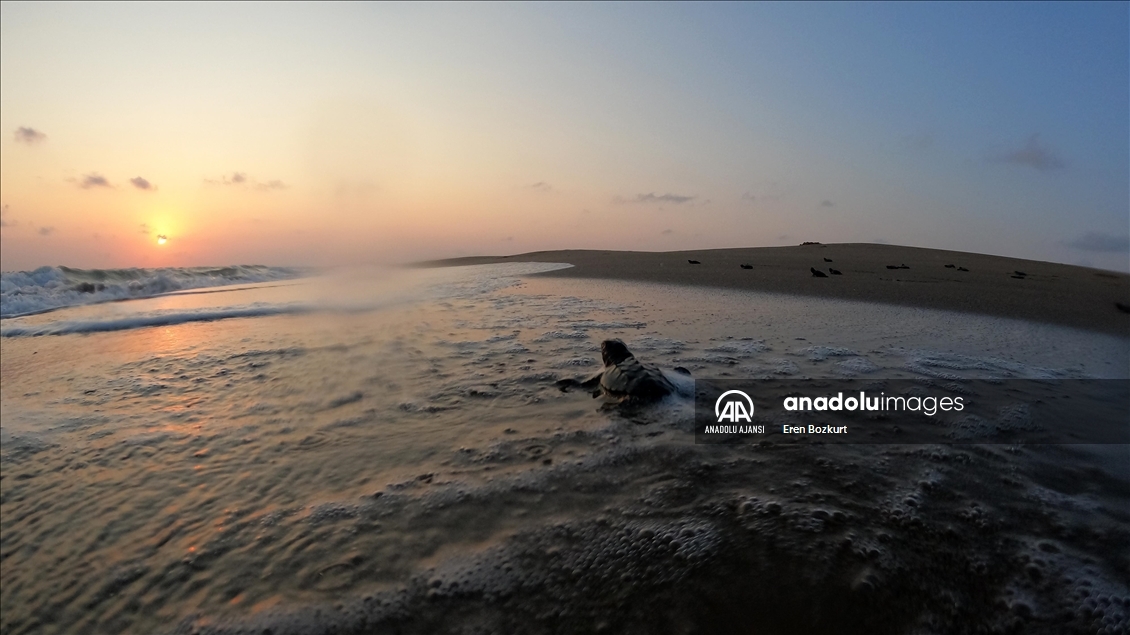 Doğu Akdeniz kıyısındaki Akyatan Yaban Hayatı Geliştirme Sahası'nda yumurtalarından çıkan yeşil deniz kaplumbağaları ve carretta carettalar, mavi sularla buluşuyor.