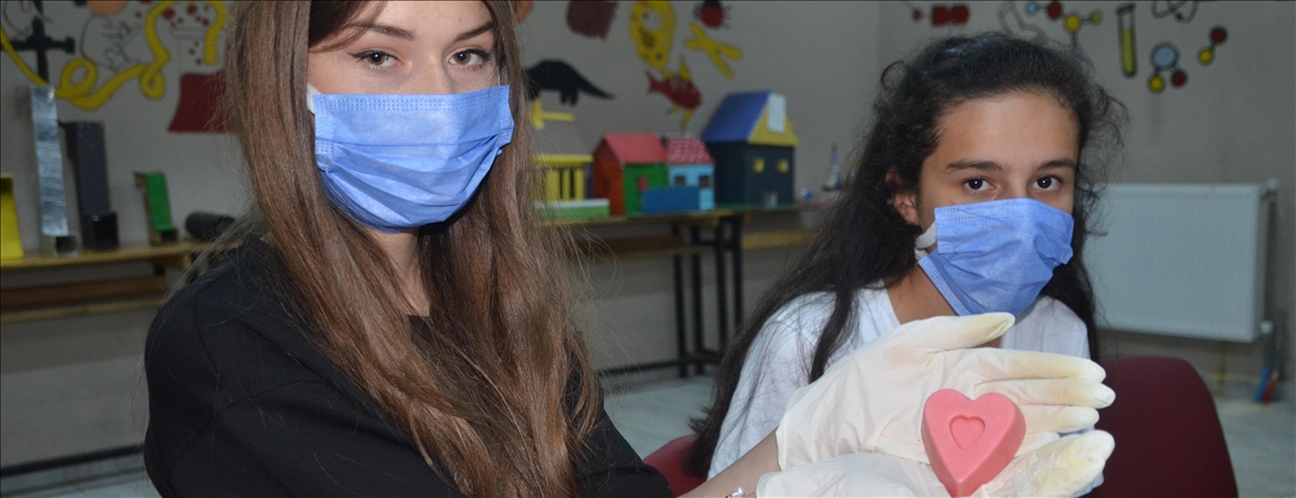 Renkli ve kokulu 60 kalıp sabunu lavabolara bırakarak ilk ve ortaokulda eğitim gören 480 öğrencinin ihtiyacını karşılayan öğretmen ve öğrenciler, gelecek yıl üretimi daha da artırmayı hedefliyor.