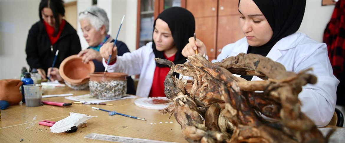 Öğretmenleri tarafından toplanan taş ve deniz kabuklarını boyayarak insan ve hayvan figürleri oluşturan, ağaç parçalarından da çeşitli sanatsal ürünler ortaya çıkaran öğrenciler, hem el becerilerini geliştiriyor hem de geri dönüşüme katkı sağlıyor.
