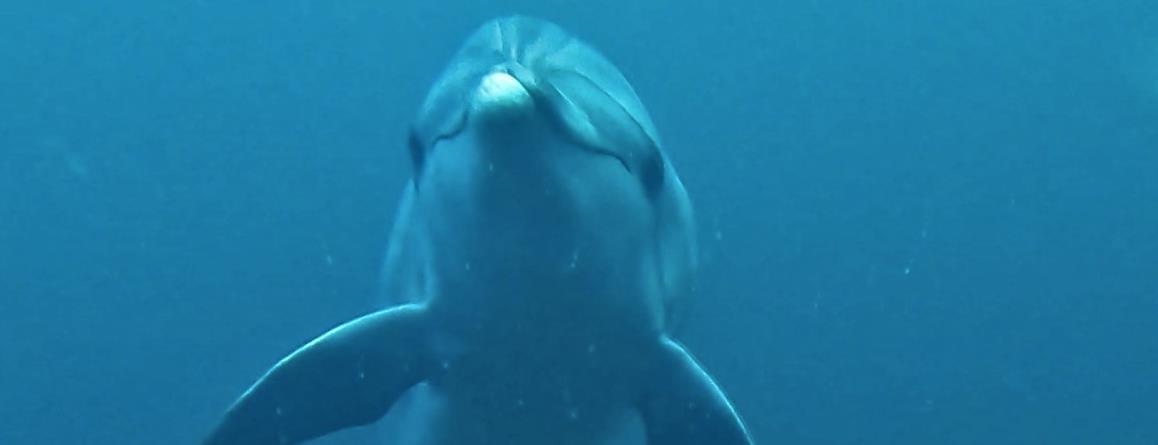 Yunuslardan biri sevimli poz verircesine Atasev'in kamerasına yaklaştı. Bir süre kameraya bakıp başını sallayan yunus, daha sonra Atasev'in yanından uzaklaştı.