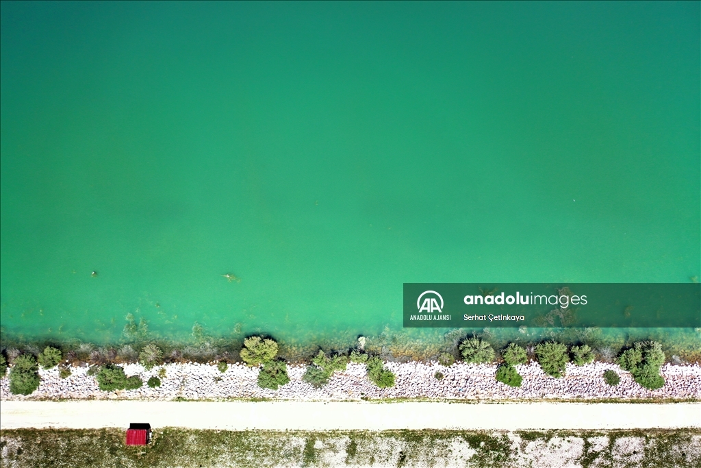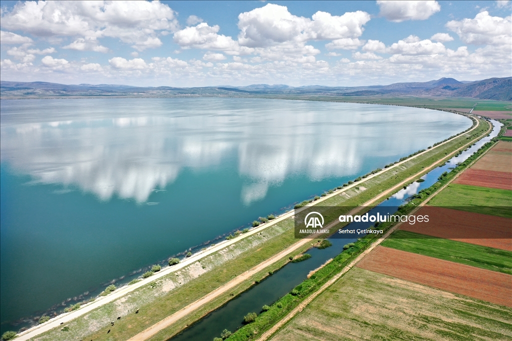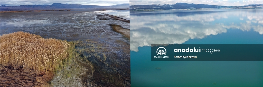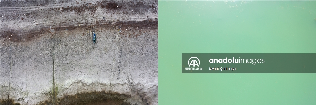 Çoraklaşıp çatlayan tabanında insanların gezebildiği gölün su miktarında altı aylık sürede yaşanan değişim, AA ekibi tarafından dronla görüntülendi.
