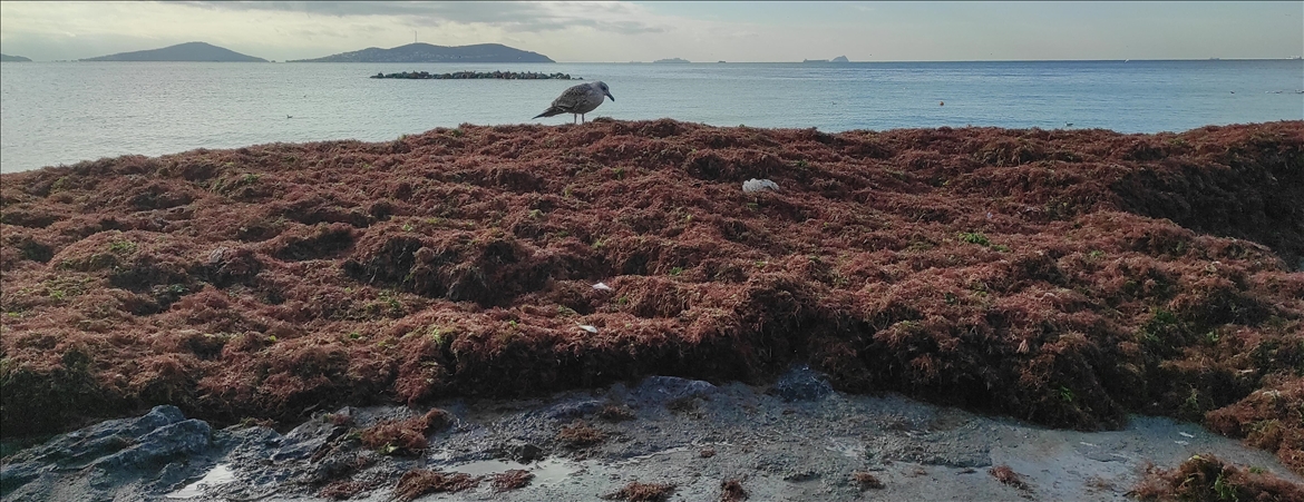 Dalgaların etkisiyle karaya vurarak sahili kaplayan kırmızı yosunlar yürüyüş yoluna da ulaştı.