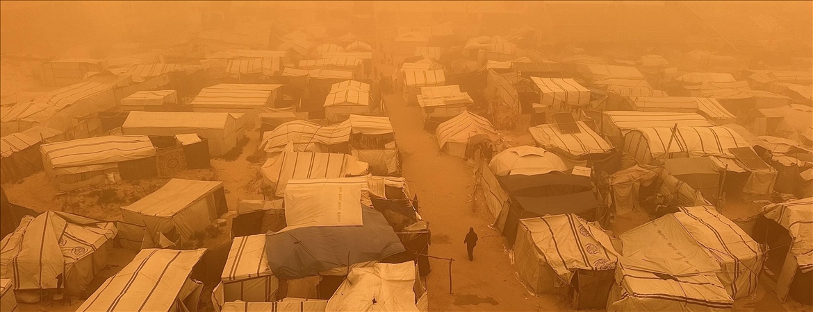 Sosyal medyada paylaşılan görüntülerde güçlü ve toz taşıyan rüzgarların, yerinden edilen Filistinlilerin çadırlarını ve çevredeki ağaçları şiddetli şekilde sarstığı görülüyor.