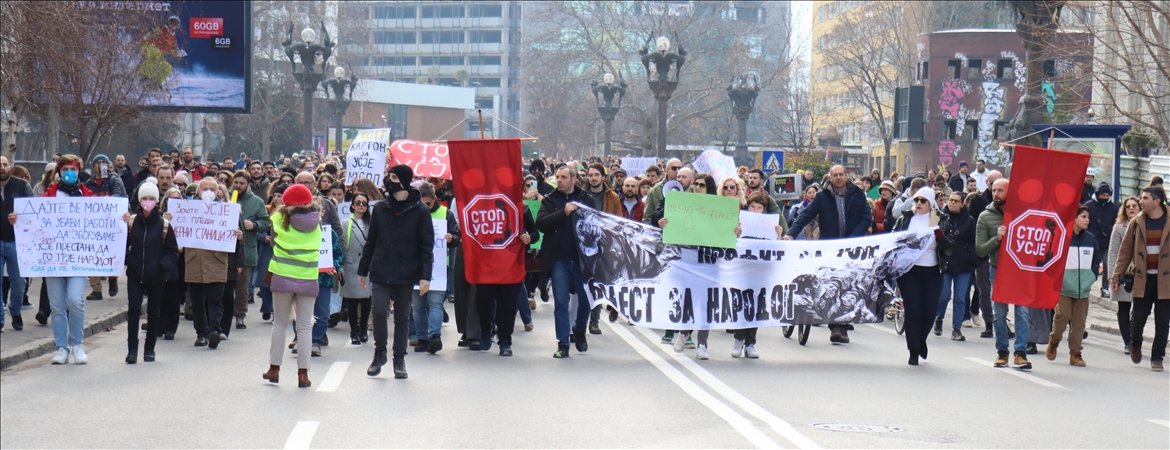 Buradan Meclis binasına ve Çevre ve Fiziksel Planlama Bakanlığına yürüyen göstericiler, "Hava lüks değil, bir haktır", "Usje'ye dur" ve "Onlar için kar, bizim için hastalık" yazılı pankartlar taşıdı.