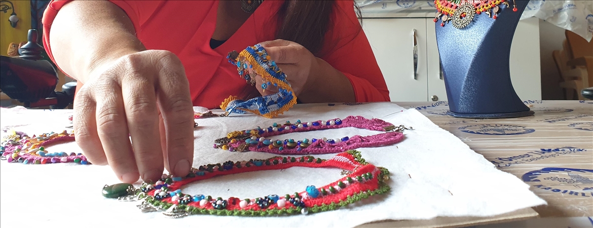 Engelliler, atölyede doğadan topladıkları ve evlerinden getirdikleri kumaş, ip, boncuk gibi atık malzemeleri yeniden değerlendiriyor.