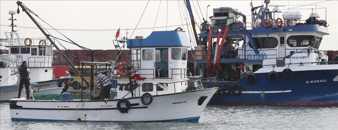 Marmara'da balık miktarının azalması nedeniyle balıkçılar, Süleymanpaşa ilçesindeki barınağa çektikleri gırgır teknelerinde topladıkları ağları onarmaya başladı.